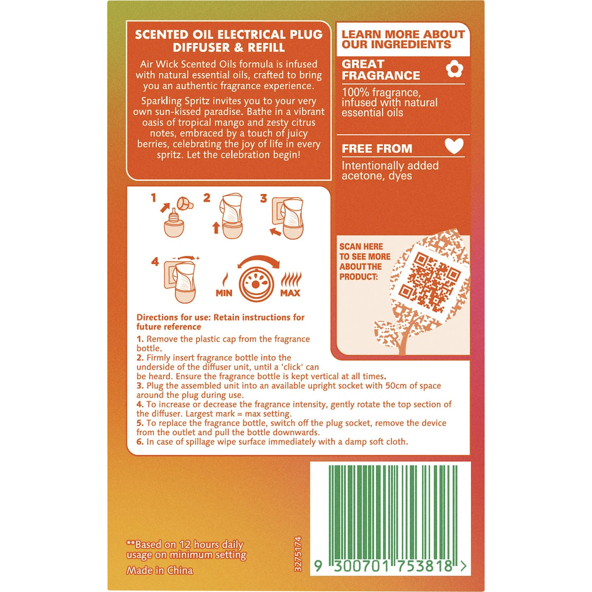 Bring a tropical paradise into your home with Air Wick Sparkling Spritz. Infused with natural essential oils, this refreshing scent combines tropical mango, zesty citrus, and juicy berries, creating a vibrant and uplifting atmosphere.