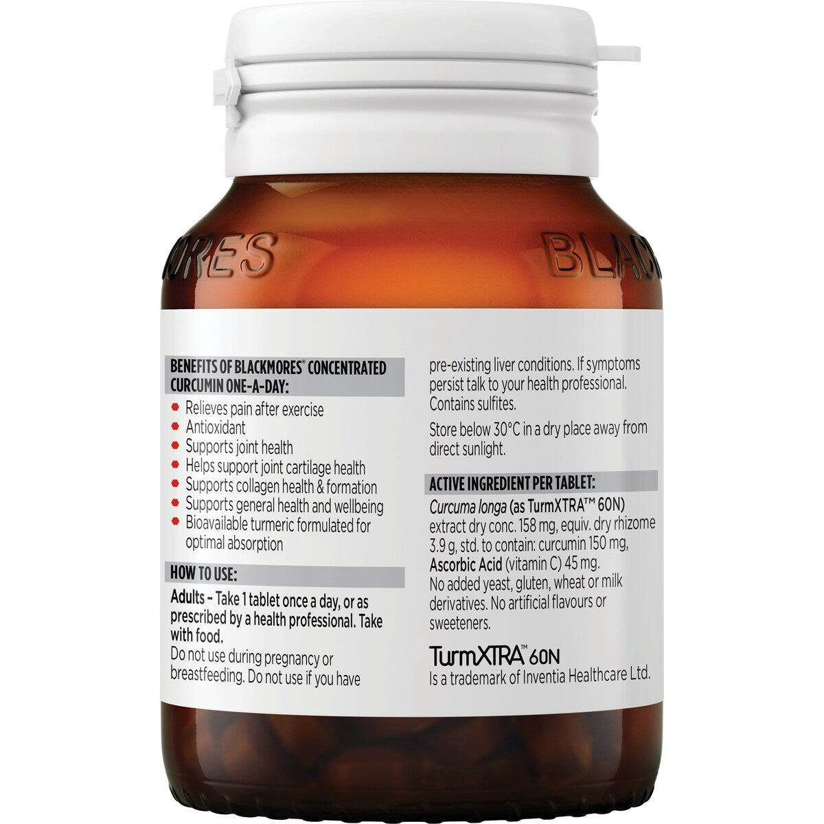 Blackmores Concentrated Curcumin One-A-Day contains a bioavailable form of concentrated curcumin (the active ingredient in turmeric) for optimal absorption which provides anti-inflammatory action and supports joint health.