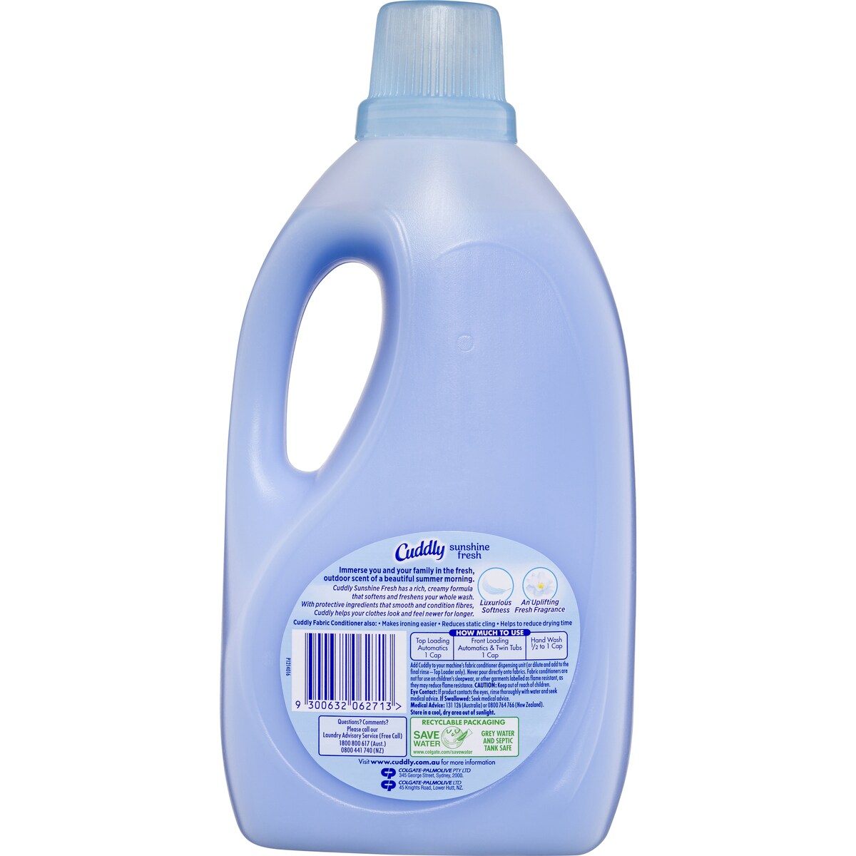 Cuddly Regular Sunshine Fresh Liquid Fabric Softener Conditioner has a rich, creamy formula that softens and freshens your whole wash. With protective ingredients that smooth and condition fibres, Cuddly helps your clothes look and feel newer for longer.
