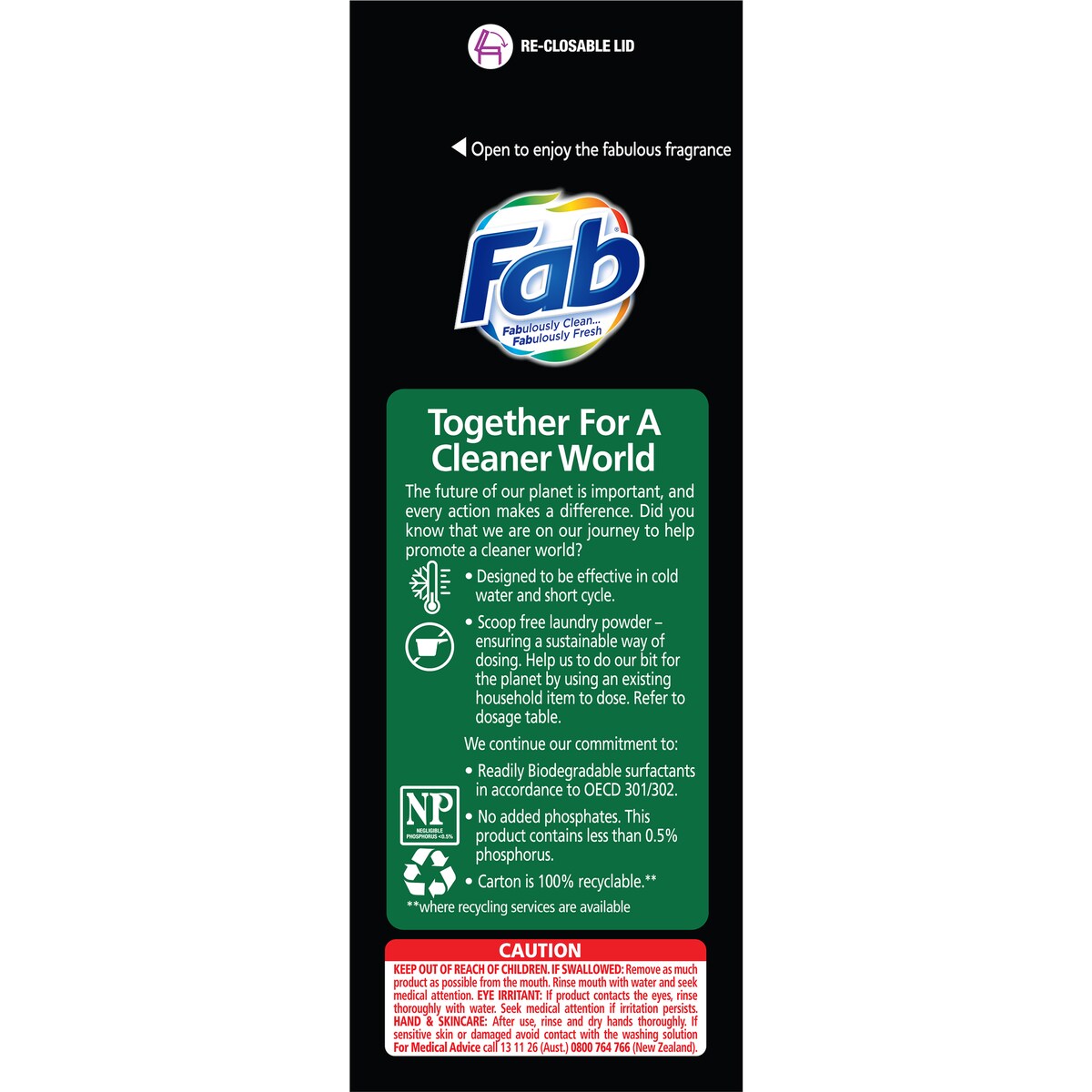 Dive into the luxurious universe of Fab Perfume Indulgence, enjoy fabulously clean…Fabulously scented laundry, even after 30 days* .Infuse your laundry with Sublime Velvet's fine fragrance, exclusively blended by our perfume experts. *Up to 30 days of ultra long lasting freshness when stored in a cupboard under ordinary conditions after laundering. Fab Laundry Detergent Washing Powders are efficient in all water temperatures and is specially developed for all machine types, Front and Top loaders. Also available in Liquid Laundry Detergent .