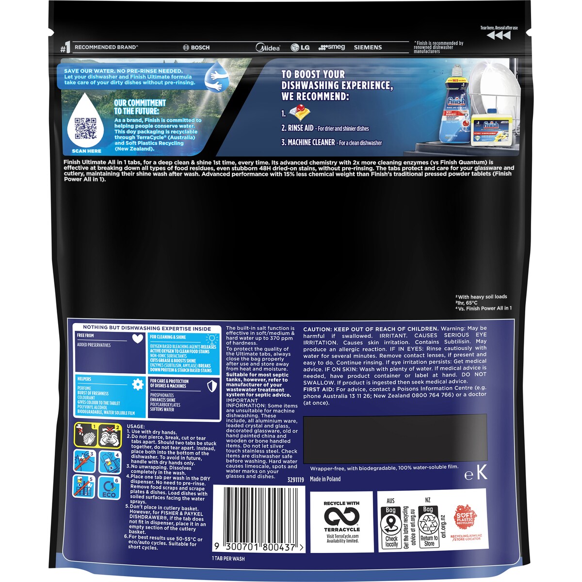Finish Ultimate All in 1 tabs, for a deep clean & shine 1st time, every time. Its advanced chemistry with 2x more cleaning enzymes (vs Finish Quantum) is effective at breaking down all types of food residues, even stubborn 48H dried-on stains, without pre-rinsing. The tabs protect and care for your glassware and cutlery, maintaining their shine wash after wash. Advanced performance with 15% less chemical weight than Finish's traditional pressed powder tablets (Finish Power All in 1).