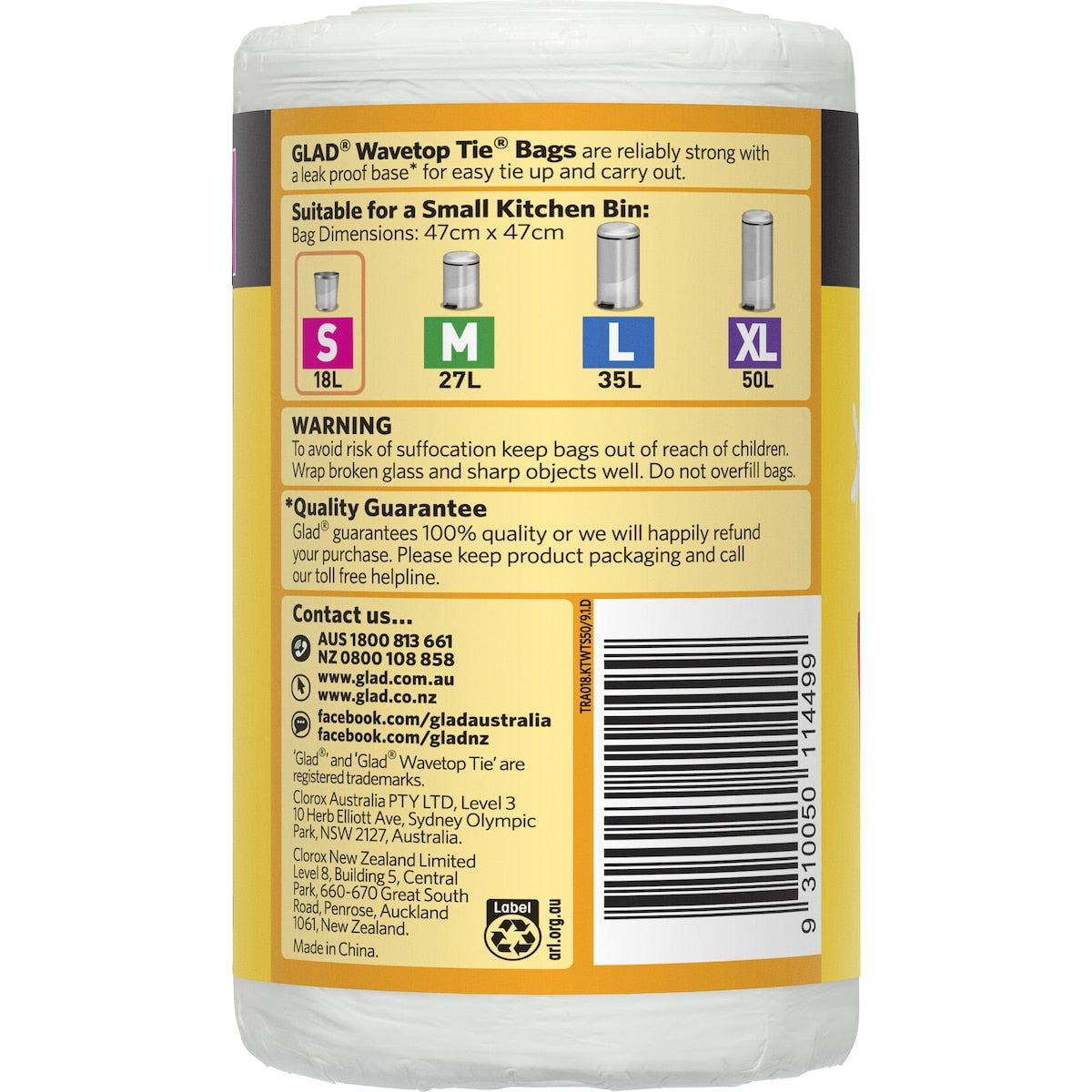 Glad Wavetop Tie Bags are reliable and strong with a unique 4-way tie system that makes them easy to tie up and carry out. The Wavetop Tie enables the bags to be closed securely even when they’re full and the Leak Proof Base ensures for an easy carry out.