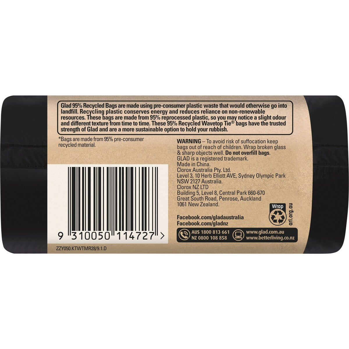 Glad to be Green 95% Recycled Kitchen Tidy Bags are made using pre-consumer plastic waste that would otherwise go into landfill. Recycling plastic conserves energy and reduces reliance on non-renewable resources. These garbage bags feature Glad's unique Wavetop Tie closure system, have the trusted strength of Glad and are a more sustainable option to hold your rubbish on it's way to landfill.