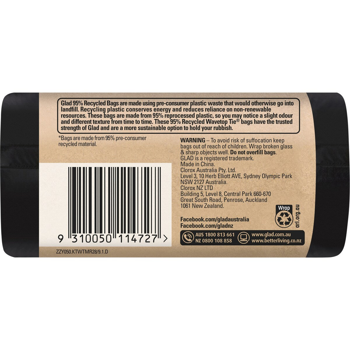 Glad to be Green 95% Recycled Kitchen Tidy Bags are made using pre-consumer plastic waste that would otherwise go into landfill. Recycling plastic conserves energy and reduces reliance on non-renewable resources. These garbage bags feature Glad's unique Wavetop Tie closure system, have the trusted strength of Glad and are a more sustainable option to hold your rubbish on it's way to landfill.