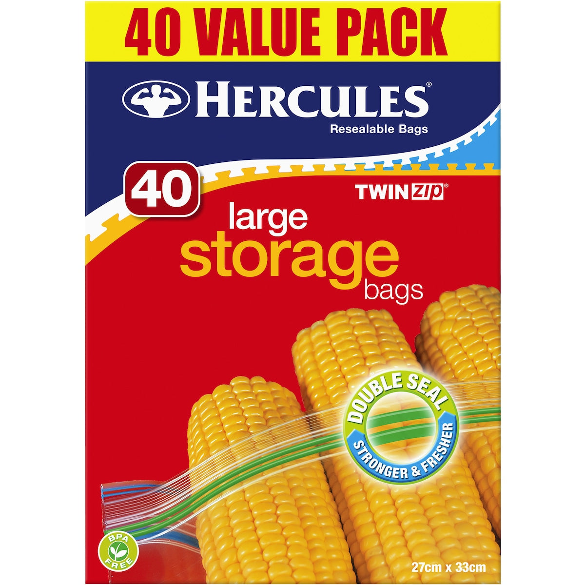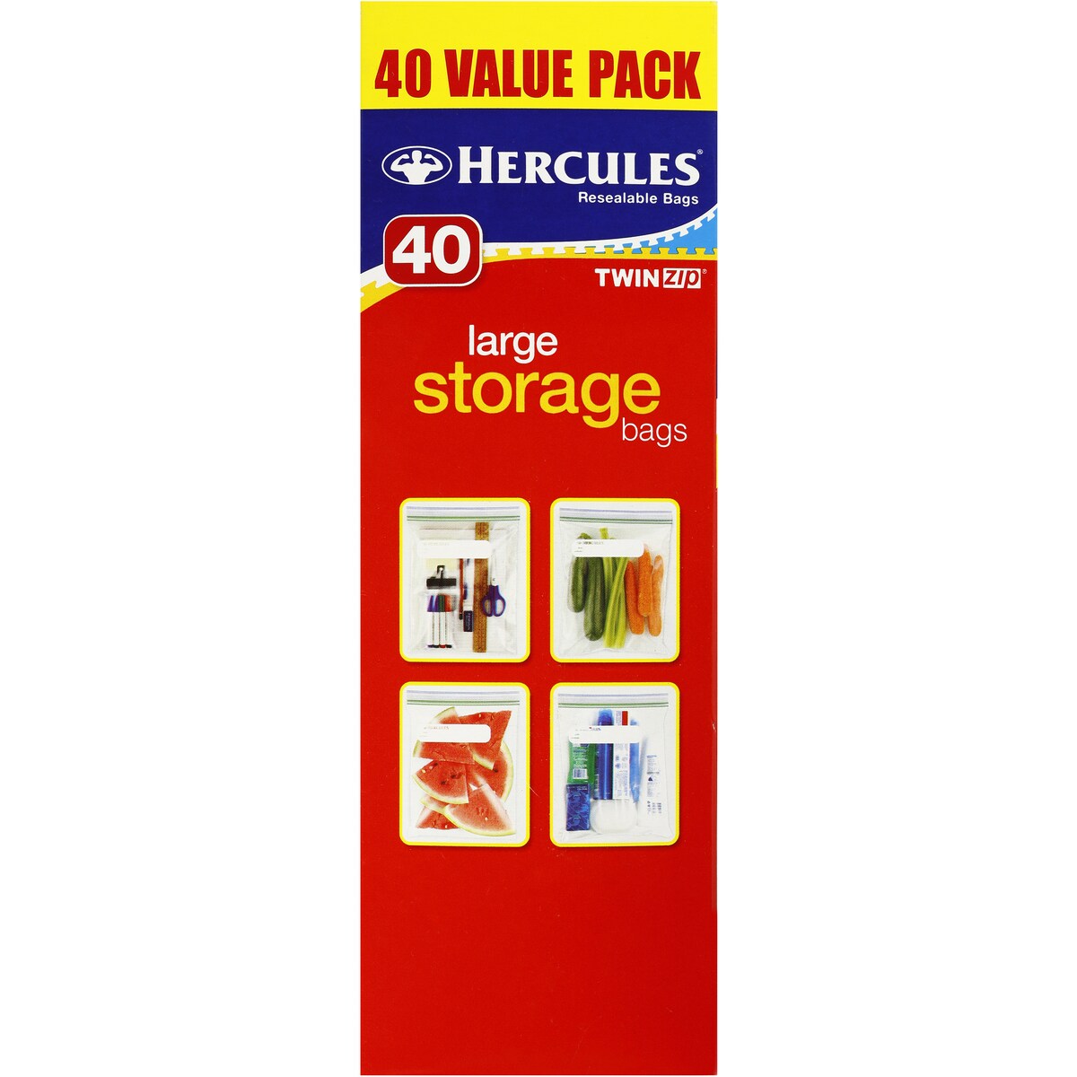 Hercules Twin Zip Large Storage Bags are a versatile way to store just about anything. Extra strong and extra large, use em to store fruit, vegetables, bread, cakes, meat and fish, as well as papers, toiletries, toys, craft and many other items. The unique double zipper also provides you with twice the seal for extra freshness and security.