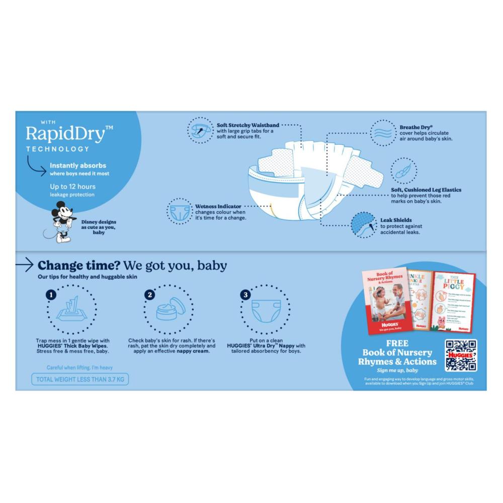 Huggies Ultra Dry Nappies for Boys with Rapid-Dry Technology instantly absorbs where they need it most for drier skin.