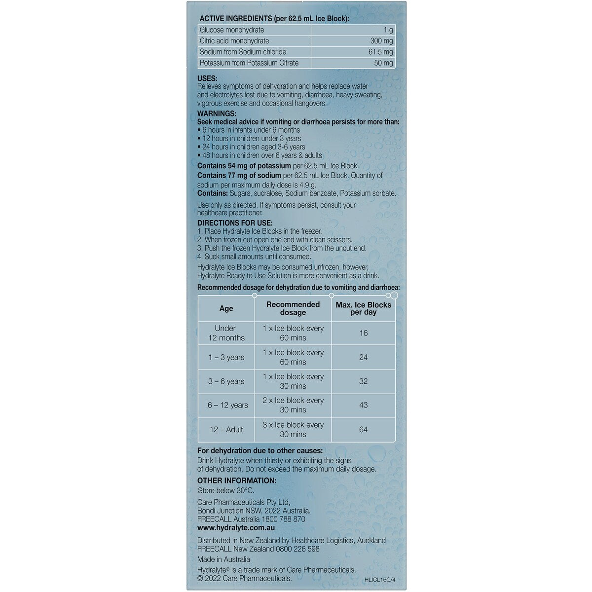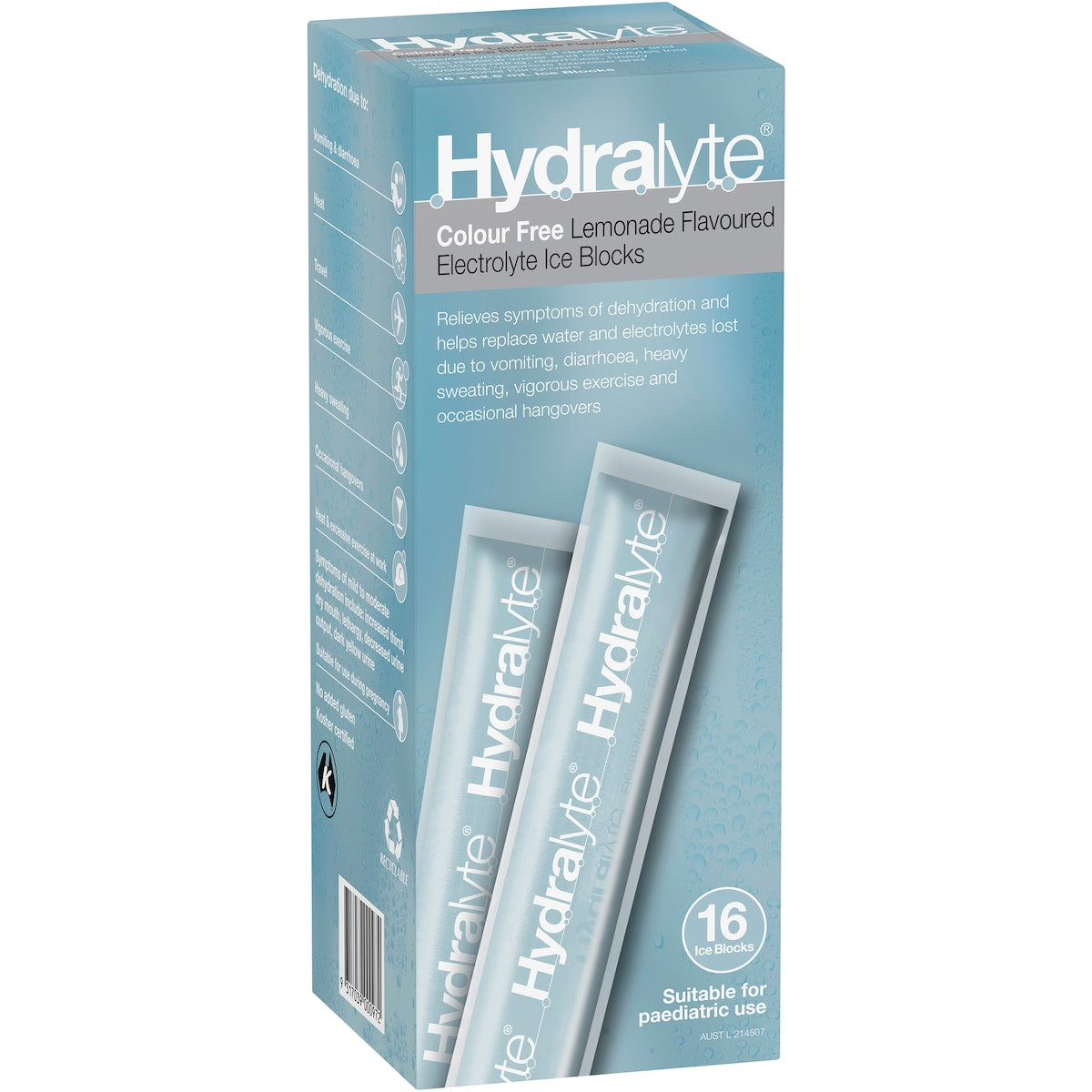 Hydralyte Electrolyte Ice Blocks Colourfree Lemonade Flavoured relieves symptoms of dehydration and helps replace water and electrolytes lost due to vomiting, diarrhoea, heavy sweating, vigorous exercise and occasional hangovers.