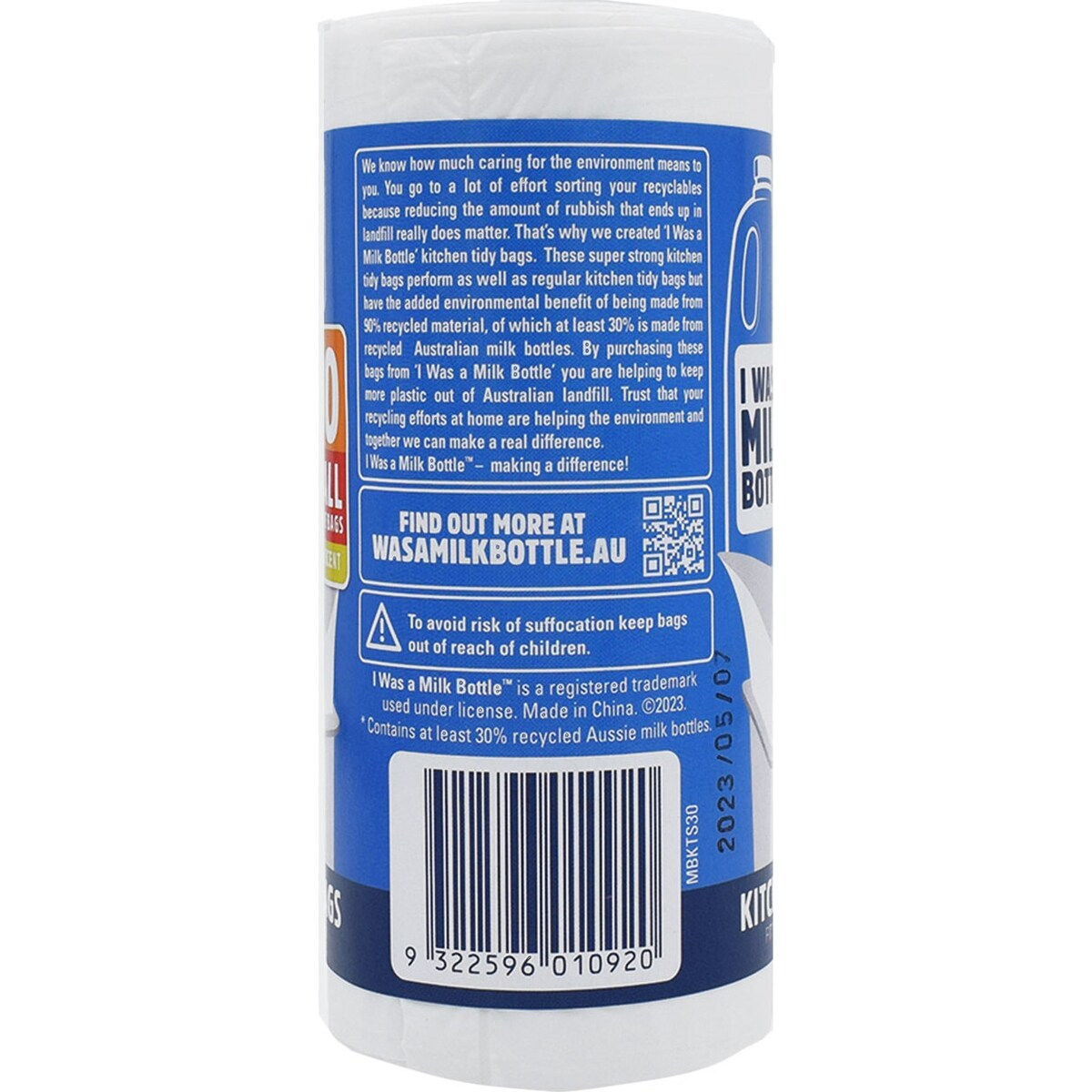 We know how much caring for the environment means to you. You go to a lot of effort sorting your recyclables because reducing the amount of rubbish that ends up in landfill really does matter. That’s why we created ‘I Was A Milk Bottle’ kitchen tidy bags. These super strong kitchen tidy bags perform as well as regular kitchen tidy bags but have the added environmental benefit of being made from 90% recycled material, of which at least 30% is made from Australian milk bottles. By purchasing these bags from ‘I Was A Milk Bottle’ you are helping to keep more plastic out of Australian landfill. Trust that your recycling efforts at home are helping the environment and together we can make a real difference.