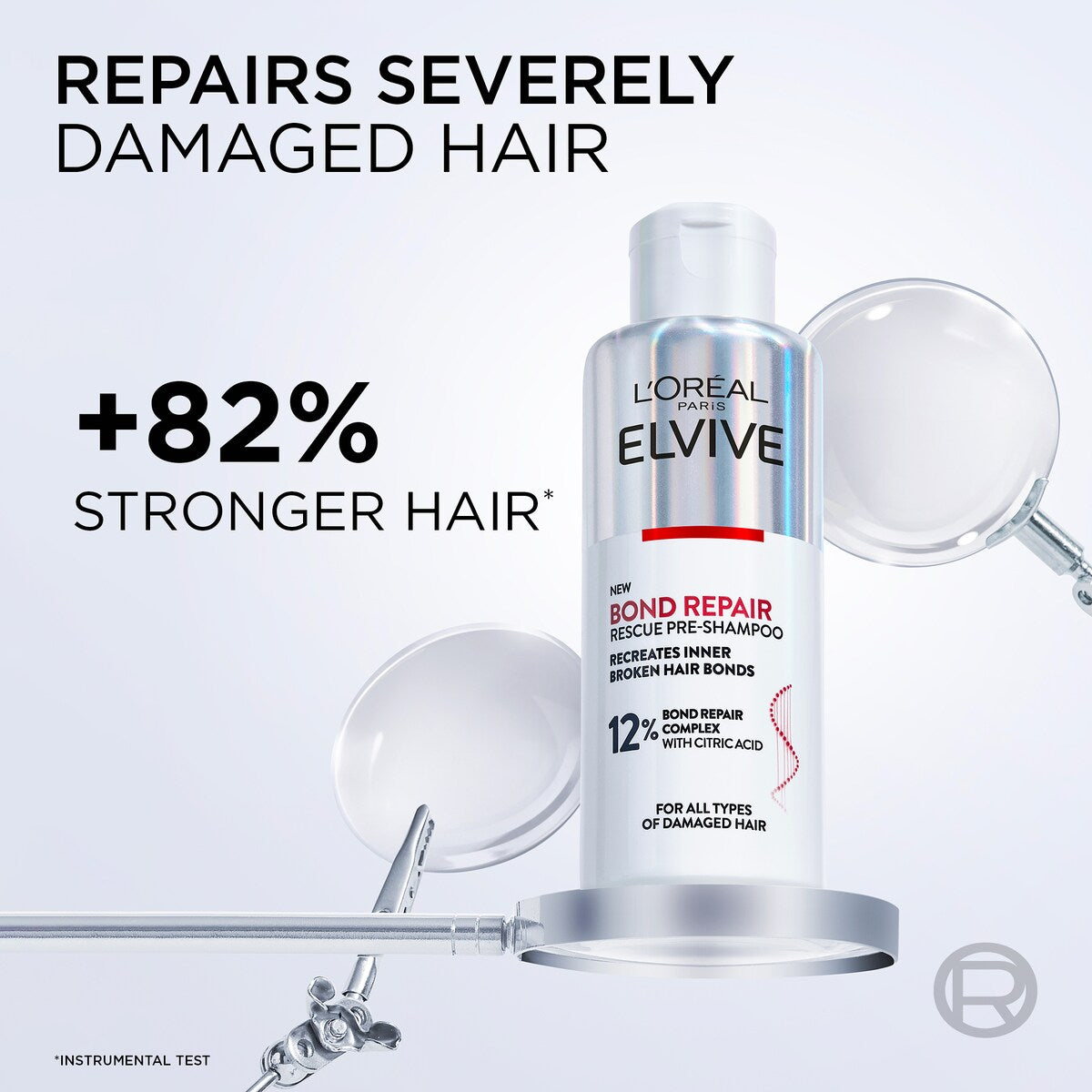 L'Oréal Paris Elvive Bond Repair Pre-Shampoo is an intensive rinse-off treatment to use before shampoo to help overcome weak and damaged hair. Our formula is powered by 12% Bond Repair complex with citric acid to go beneath the hair surface to reinforce broken hair bonds for +98% stronger hair*.*Instrumental test on Pre-Shampoo + Shampoo + Conditioner