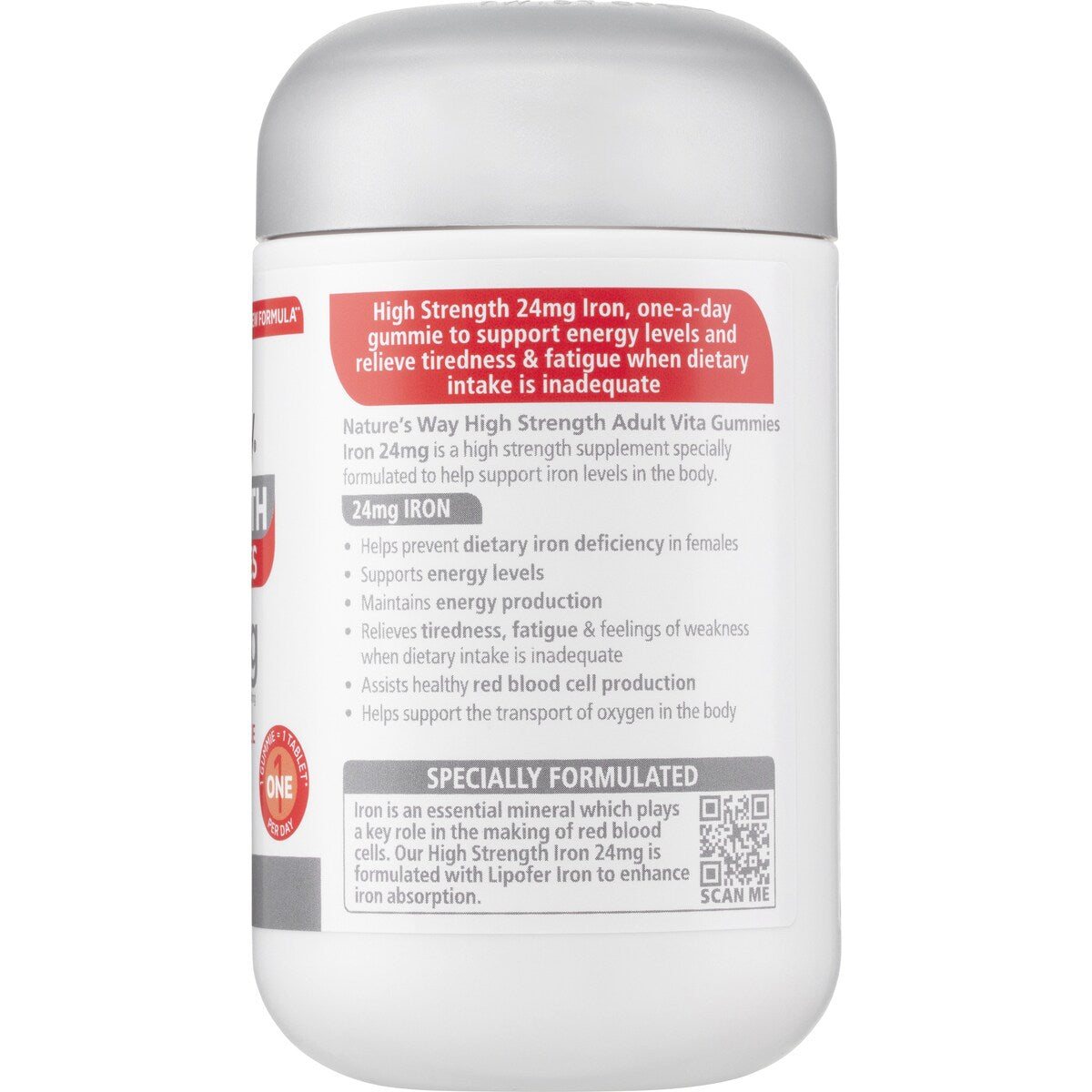 Nature's Way High Strength Adult Vita Gummies Iron 24mg is a high strength, one-a-day supplement with 24mg of iron to help relieve tirednees & fatigue and prevent dietary iron deficiency. 99% Sugar Free.