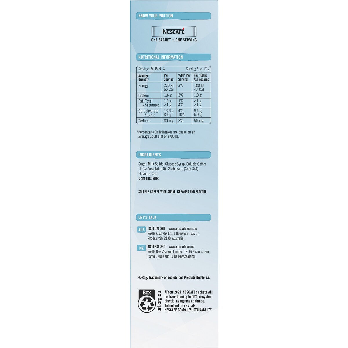 From 2024, NESCAFE individual sachets will be transitioning to 50% recycled plastic, using mass balance.