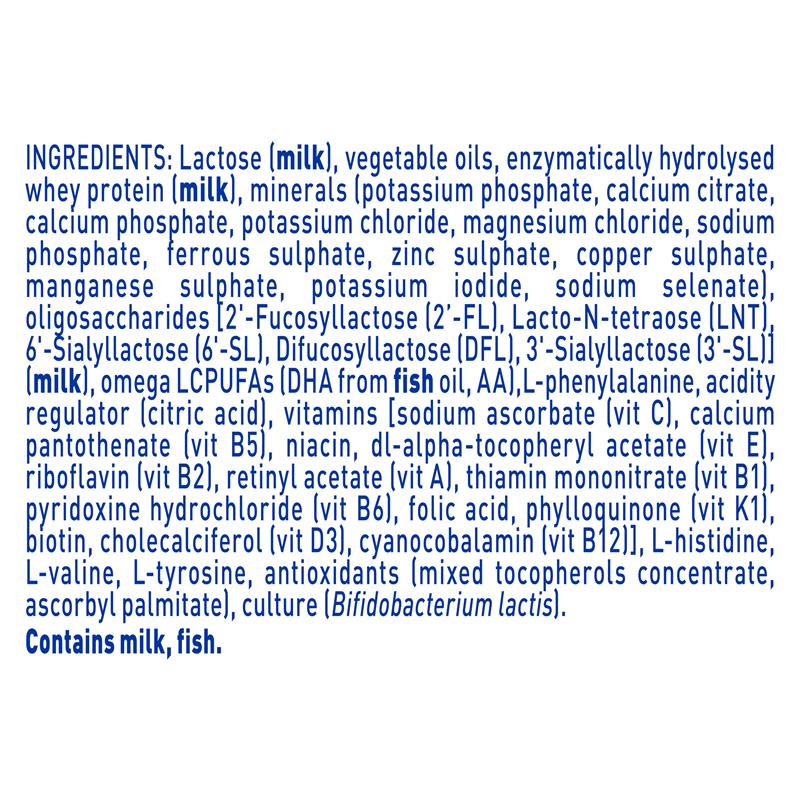 Lactose, vegetable oils, hydrolyzed whey protein, minerals, oligosaccharides, omega LCPUFAs, vitamins, and culture.