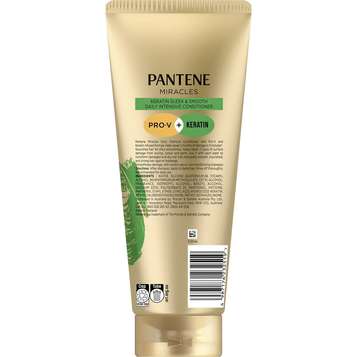 Pantene Miracles Daily Intensive Conditioner with Pro-V and Keratin-infused formula, helps repair 3 months of damage in 3 minutes*.Nourishes hair for silky smoothness. Helps repair 3 types of surface damage from styling, colour and perm. Use it with each wash to transform damaged and dry hair into noticeably smooth, nourished, and strong hair against breakage.*smoothness damage, with system use vs. non-conditioning shampoo
