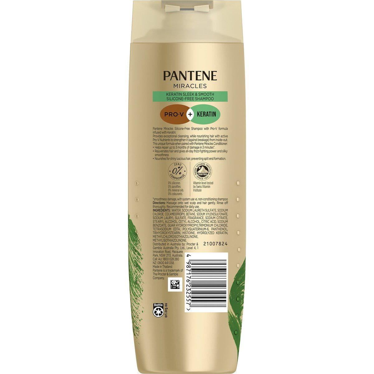 Pantene Miracles Silicone-Free Shampoo with Pro-V formula infused with Keratin:Provides exceptional cleansing, while nourishing hair with active Pro-V Nutrients to strengthen it (against breakage) from inside-out. This unique formula when paired with Pantene Miracles Conditioner:•Helps repair up to 3 months of damage in 3 minutes*.•Rejuvenates hair and gives all-day frizz-fighting power and silky smoothness•Nourishes for shiny luscious hair, preventing split end formation.*smoothness damage, with system use vs. non-conditioning shampoo
