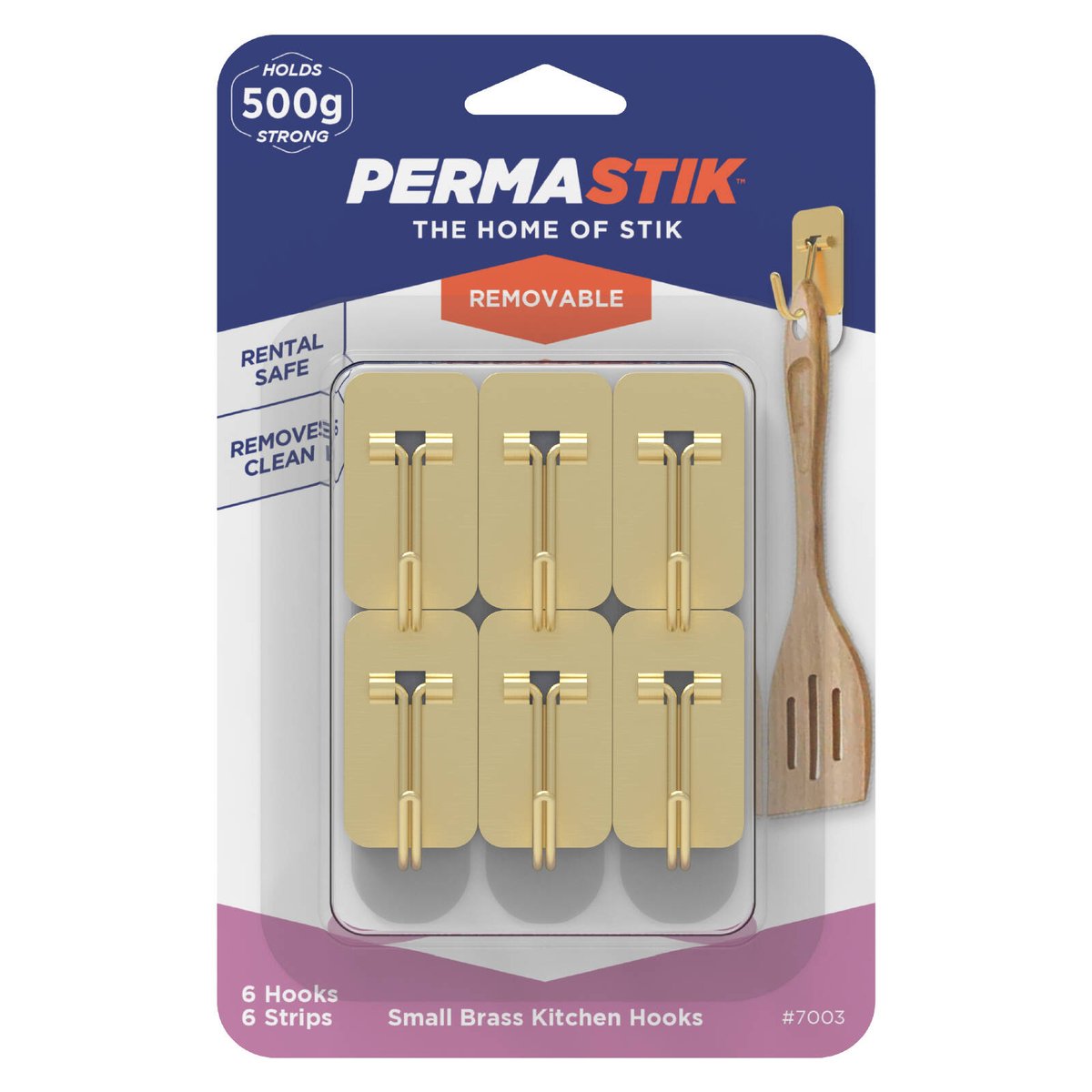 Permastik Small Brass Kitchen Hooks 6 Pack are designed for hanging small kitchen items securely without the need for drilling or screws.
