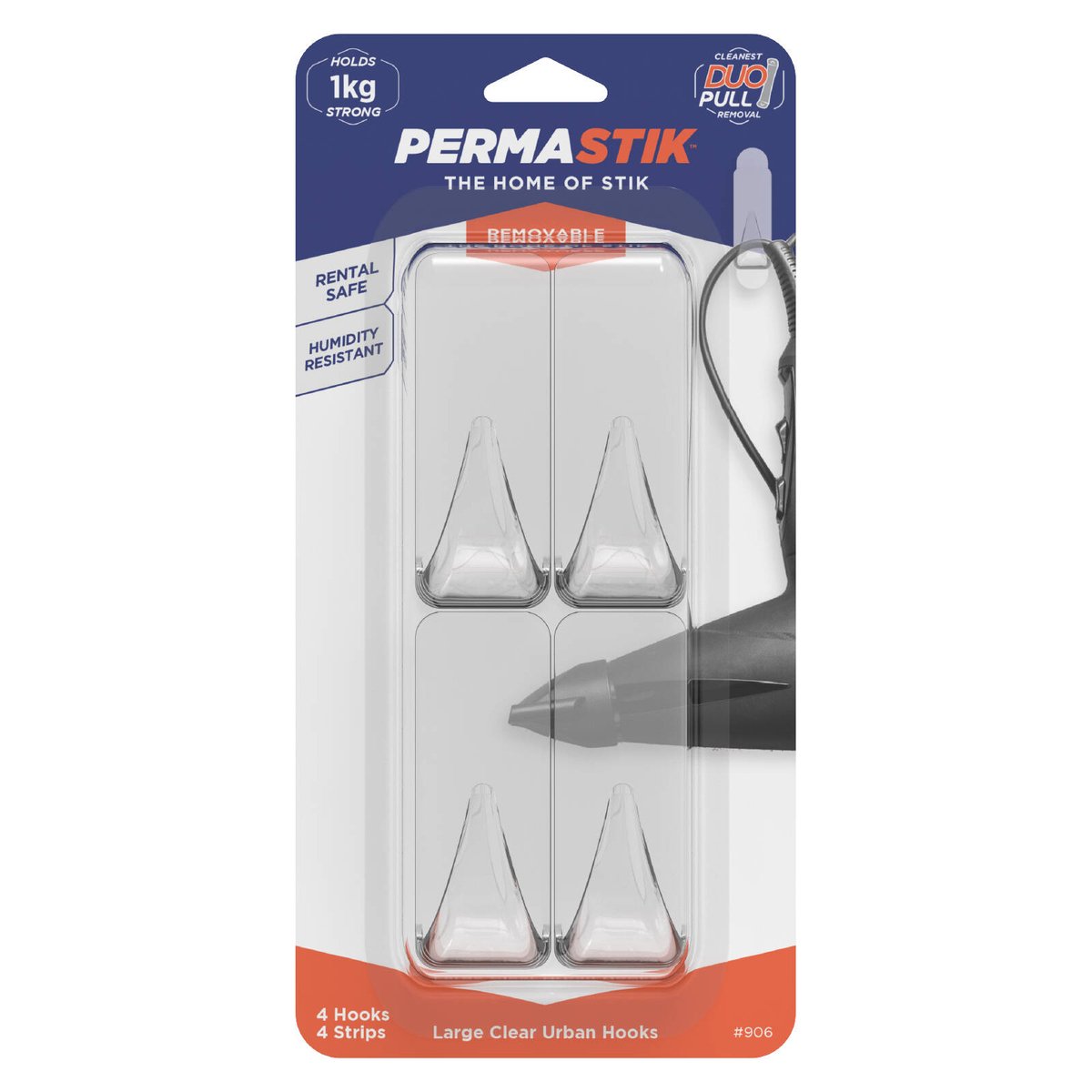 The Permastik Large Clear Urban Hooks 4 Pack provide a practical solution for temporary hanging needs.