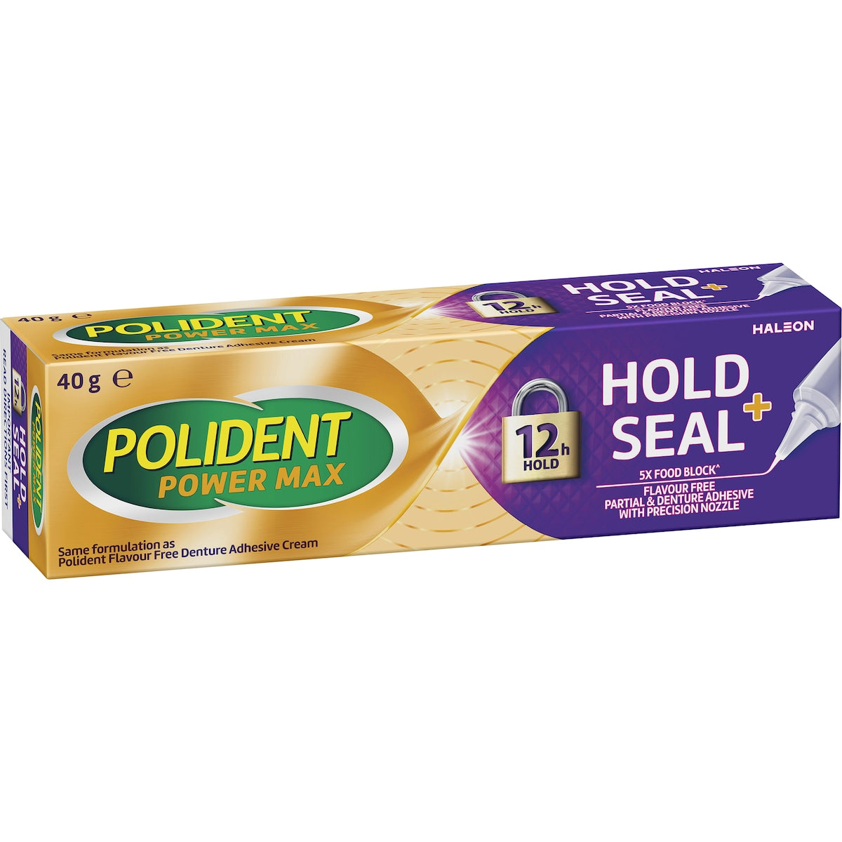 Polident Max Seal delivers superior surface coverage (Compared to standard Polident Flavour Free Denture Adhesive Cream) for food seal protection and strong all-day hold. The precision nozzle enables exactly the right amount of product to be applied around the edge of your denture forming an all-around seal.