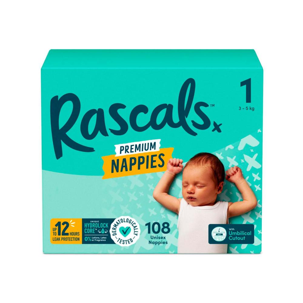 Rascals Premium Nappies Size 1 (3-5kg) - 108 Pack