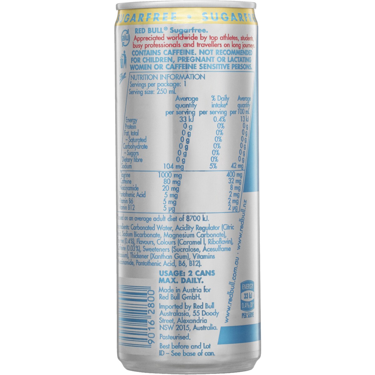 RedBull Sugarfree's special formula contains ingredients of high quality: Caffeine, Taurine, B-Group Vitamins, Aspartame & Acesulfame K, Alpine water