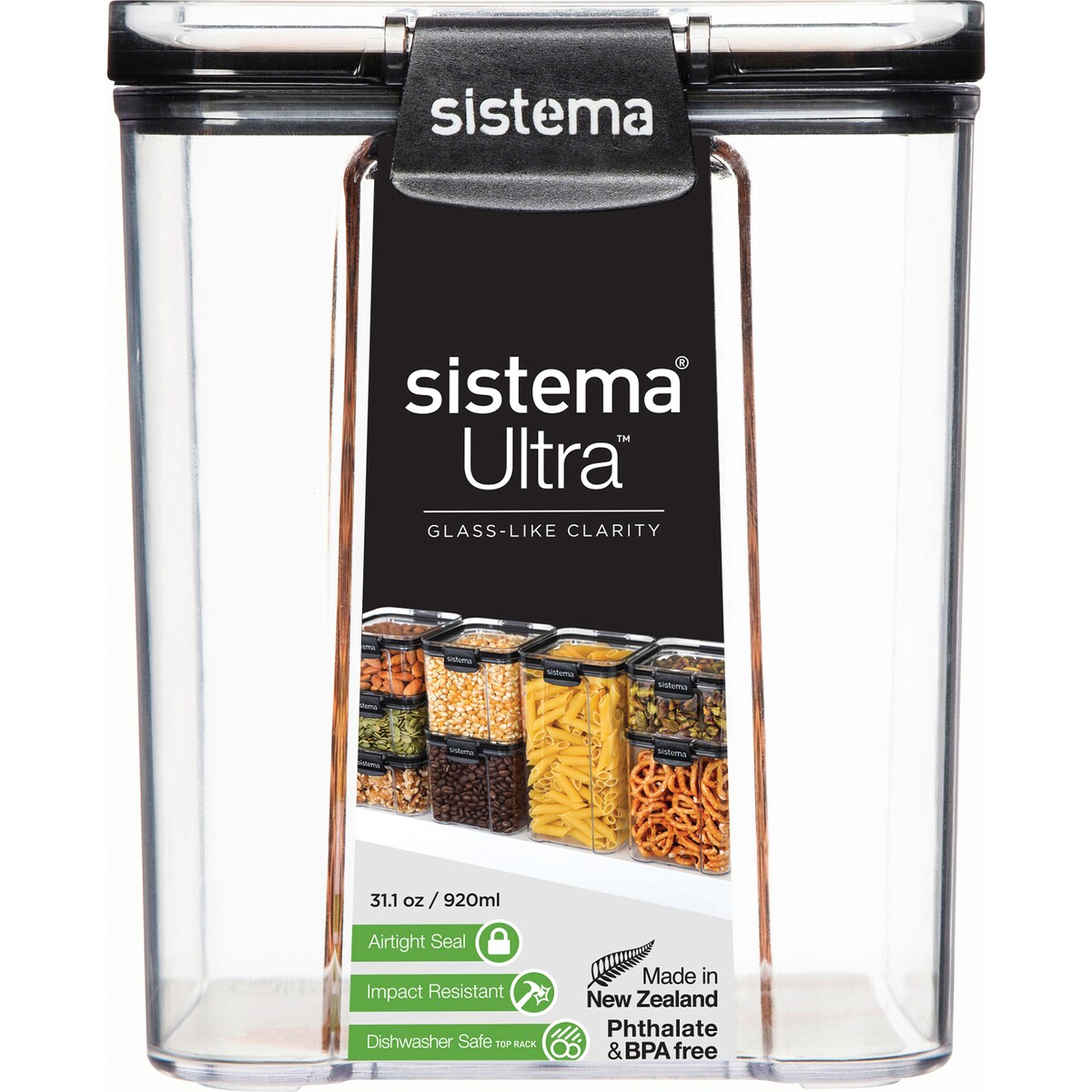 Sistema Ultra containers are perfect for your countertop or pantry. This premium product is made from ultra-clear TRITAN with glass like clarity. Containers are impact, shatter and stain resistant. Sistema’s clever modular design stacks perfectly for efficient storage with an airtight seal that keeps ingredients fresh. Simply place your food into the container and close the distinctive Sistema easy-locking clips to seal. This product is stackable and safe to use in the dishwasher (on the top rack), or in the fridge and freezer. Designed and made in New Zealand. Phthalate free and BPA free.