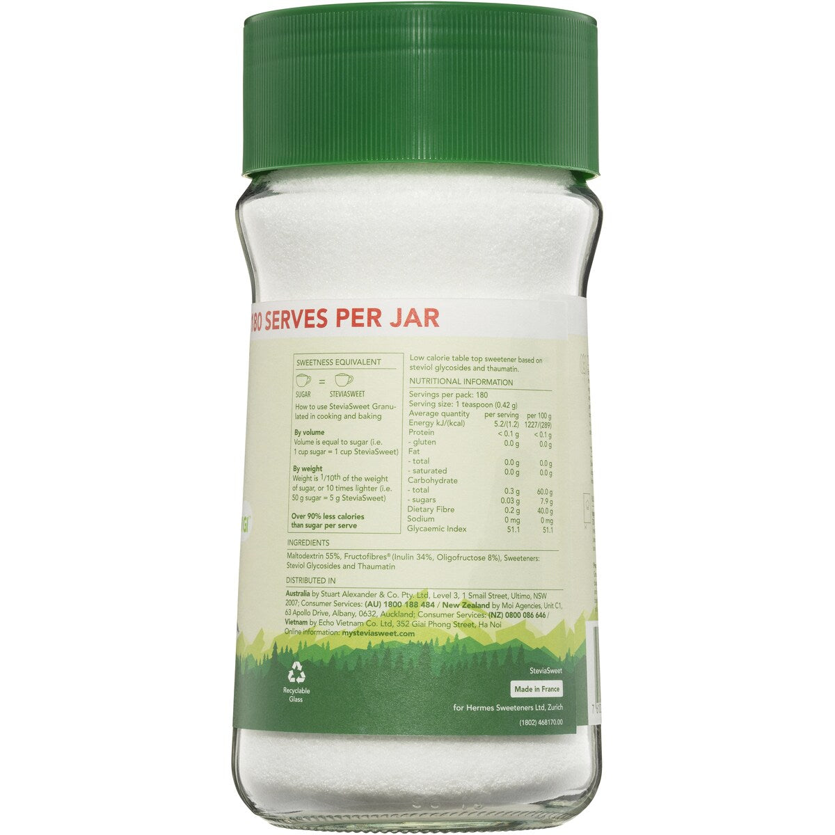 Enjoy the great tasting 100% Natural low calorie sweetness in SteviaSweet which comes from the leaves of the stevia plant, combined with other natural ingredients. SteviaSweet Granulated Sweetener is the clever new way to sweeten your food and drinks naturally, with over 90% fewer calories than sugar per serve. Just 5.2kJ (1.2 kcalories) per teaspoon of SteviaSweet Granulated compared to 70kJ (16.7 kcalories) per teaspoon of sugar for the same amount of sweetness!