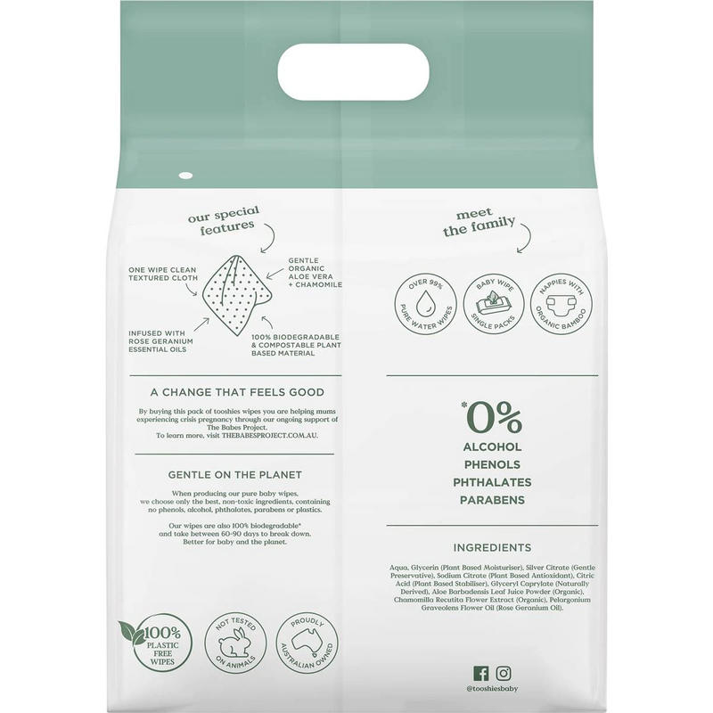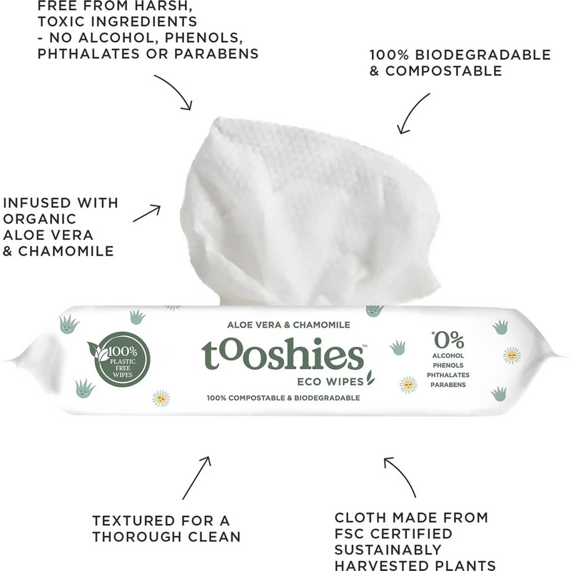 Made with nourishing organic ingredients, tooshies Aloe Vera & Chamomile baby wipes are 100% plastic free, biodegradable and compostable.