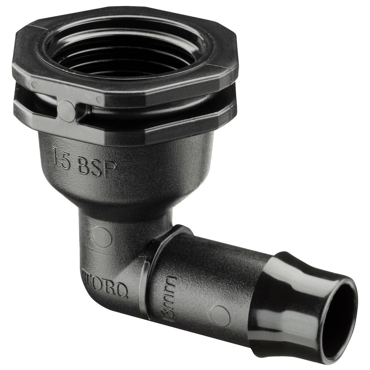 Toro Barbed Female Threaded Elbow - 13mm x 15mm is a durable polypropylene fitting designed for connecting 15mm male fittings into 13mm poly tubing.