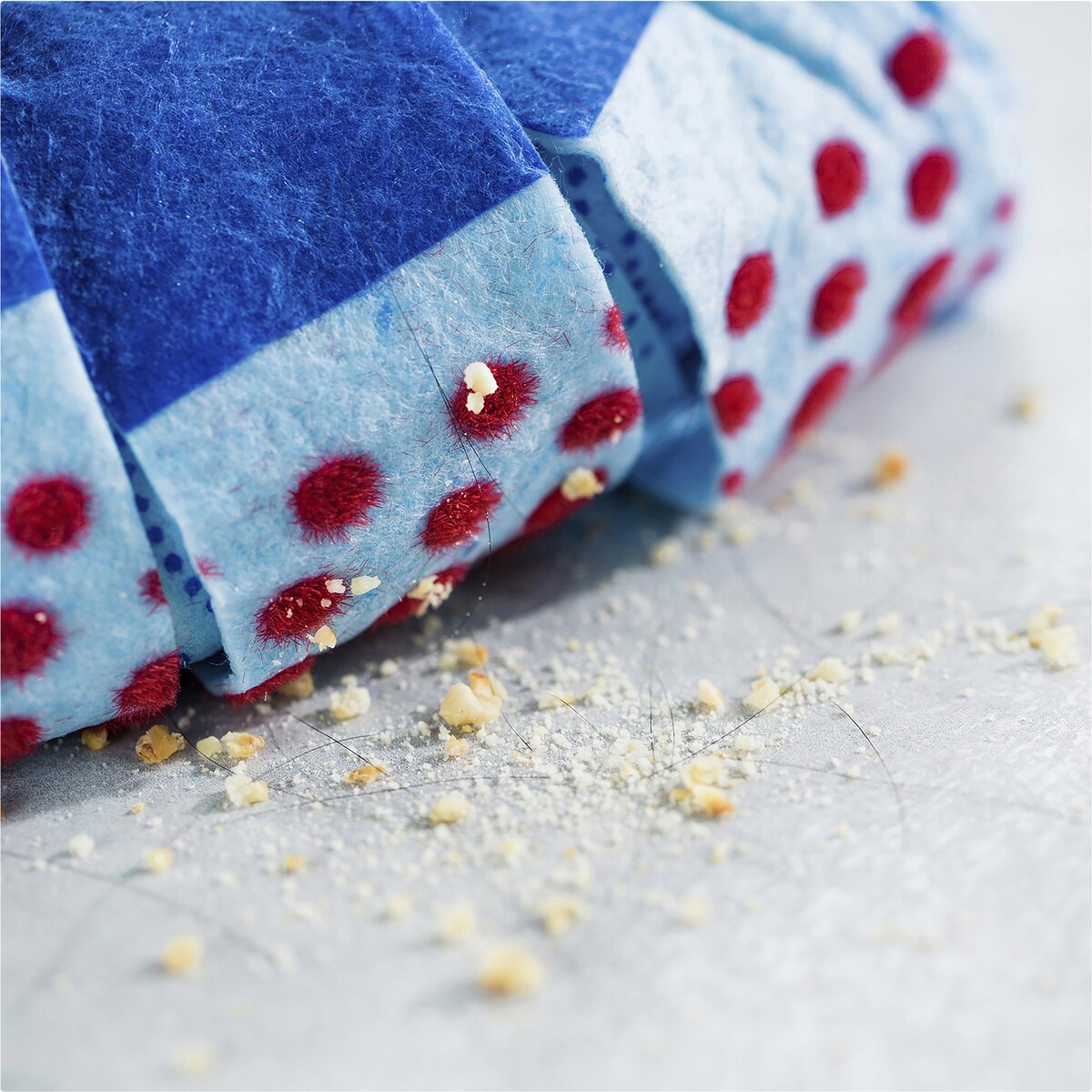 It provides three key cleaning actions for deep down cleaning: Red non-scratch scourer for stubborn dirt removal, blue microfibre zone to remove greasy residue and 3D red power dots for extra hair and particle pick up.