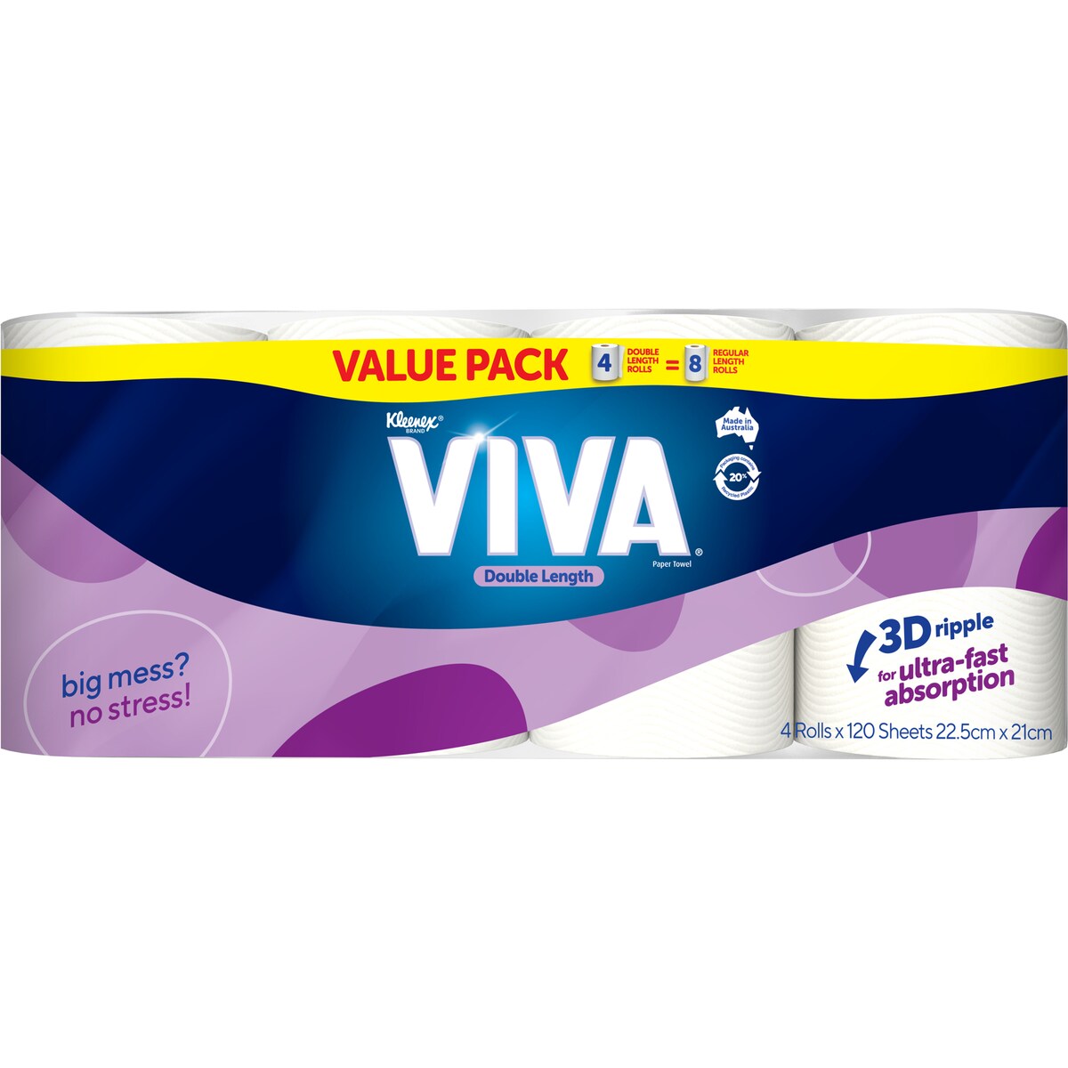 VIVA Multi-Purpose Cleaning Towel – a versatile, fast-absorbing paper towel which helps you deal with mess quickly and effectively. The Double length roll has twice the amount of sheets (120 vs 60) so it lasts longer, meaning less roll changes.