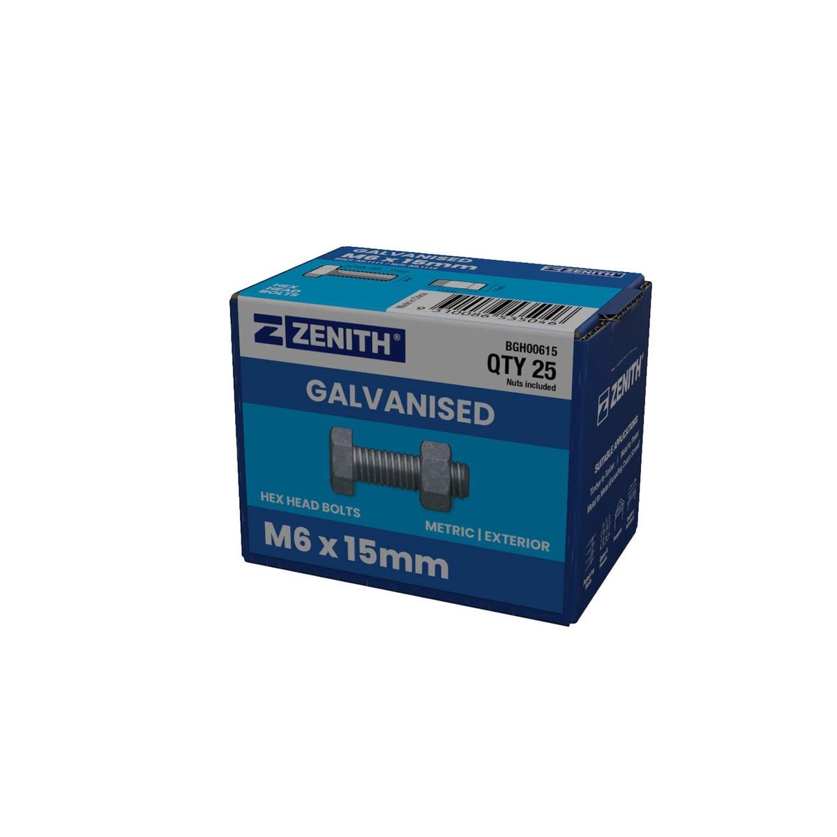 Zenith m6 x 15mm Hot Dip Galvanised Hex Head Bolts and Nuts 25 Pack are designed for general purpose construction applications, providing reliable fastening solutions.